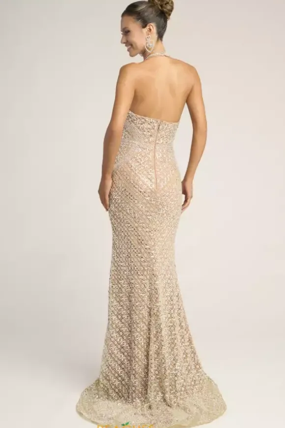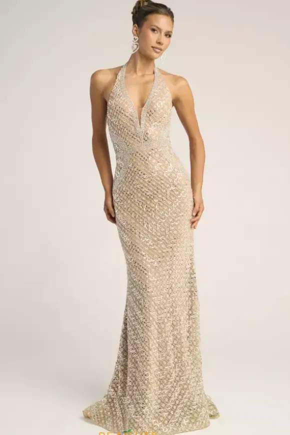 This luxurious nude and silver fully beaded Portia and Scarlett long dress style PS26425C is pageant perfect. The sexy deep halter neckline gives glamorous support and reveals an open back with a zipper closure. Silver beadwork accentuates the small of your waist and traces the neckline. This dress is completed with a sweep train.