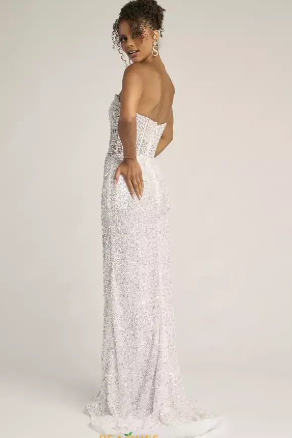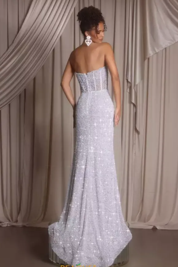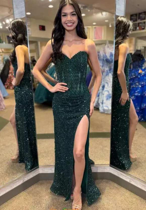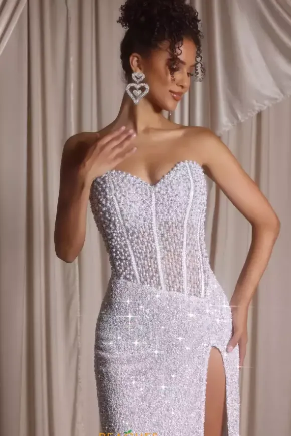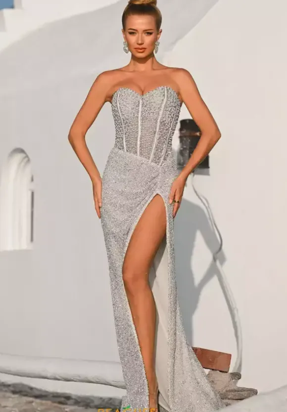 Look red carpet ready in this scintillating Portia and Scarlett long dress style PS26432C embellished with pearls, beads and sequins. This impeccable gown features an illusion, strapless corset with a sweetheart neckline, exposed boning and low back with zipper closure. The long, slim skirt has ruching to one side and high, front, side slit.