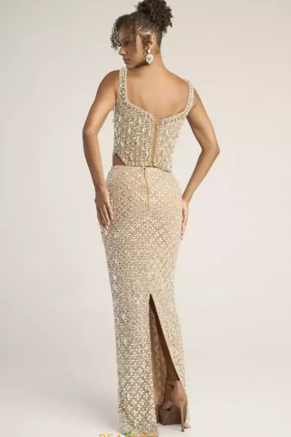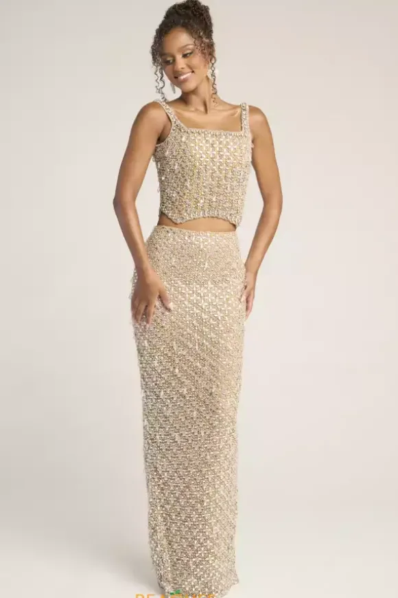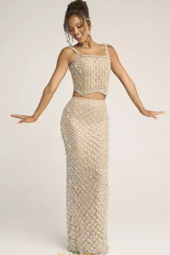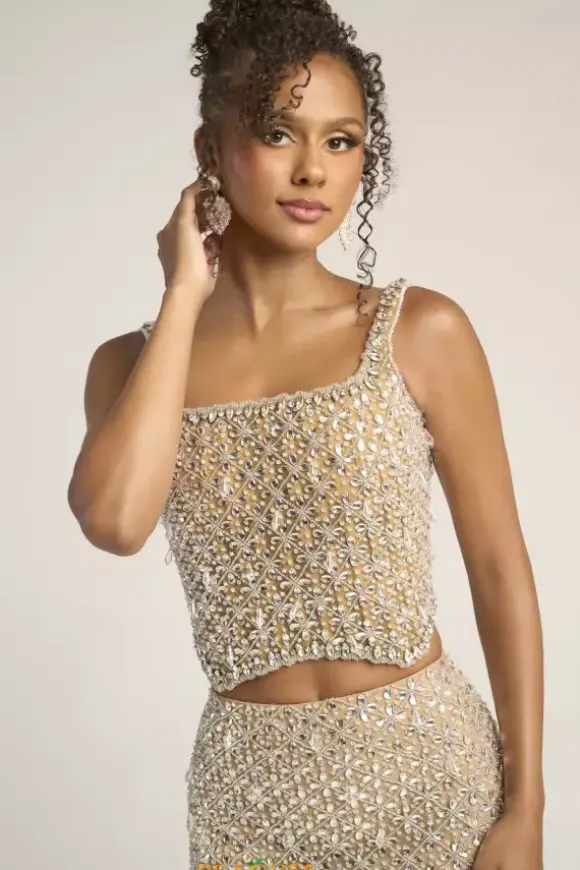 Look fun and fabulous at prom in this outstanding Portia and Scarlett two piece dress style PS26433C embellished in a cross hatch pattern of crystals, pearls and beads. This magnificent ensemble showcases a fitted crop bodice with tank style straps with zipper closure back. The long slim skirt hugs your figure and has a sexy back slit.
