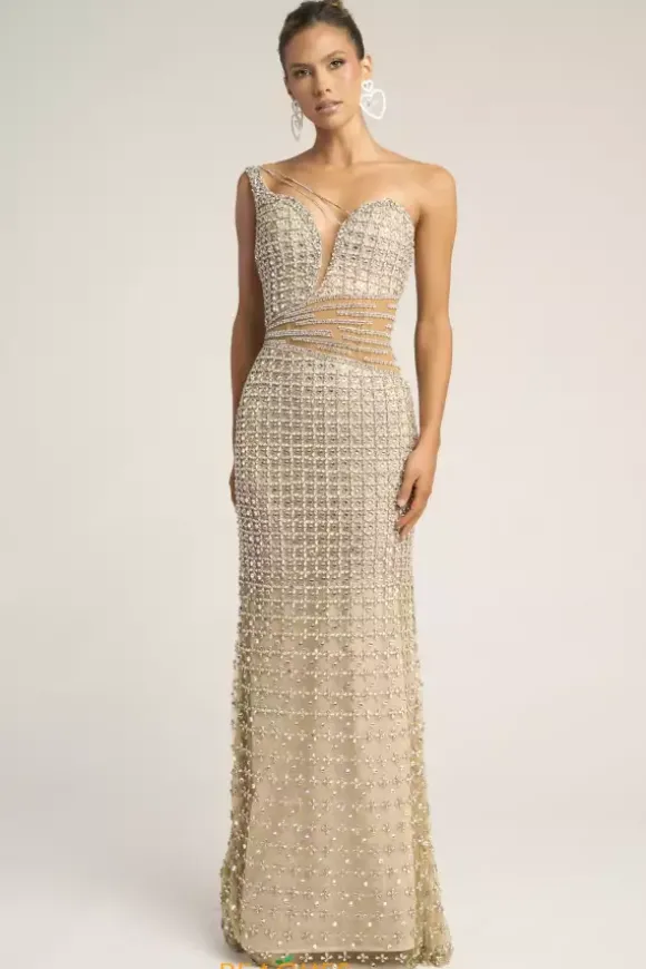 Sophistication exudes when you wear this elaborate Portia and Scarlett long dress style PS26434C drenched in an intricate pattern of crystals and beads. This impeccable gown showcases a fitted bodice with an asymmetrical neckline and single shoulder strap. The long, straight skirt flows beautifully to the floor.
