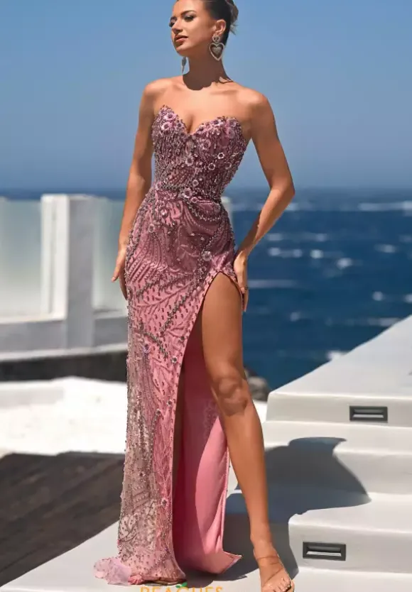 Step off the red carpet and into your special event in this striking Portia and Scarlett long fitted dress style PS26442C. The strapless v neckline dress is bedazzled with the best bead work. Three dimensional flowers made from sequins are showcases through out the dress. Available only in this stunning pink color.