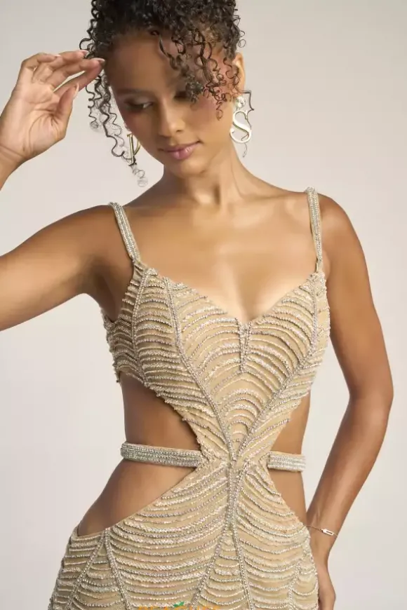 Rows and rows of beading give this Portia and Scarlett long dress that perfect vintage vibe. Style PS26455C has a v neckline with thick shoulder straps. The sides of the dress are cut out with a matching beaded straps that wraps around to define your shape. The endless beadwork gives a sleek old hollywood look.