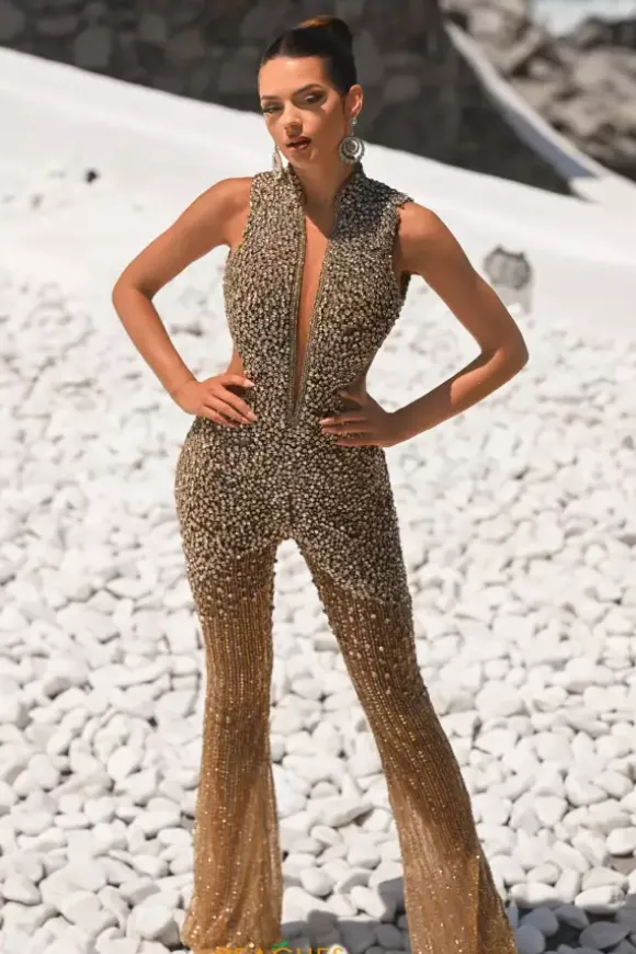 Have a major fashion moment in this jaw dropping Portia and Scarlett jumpsuit style PS26466C. Available only in gold, this high collared top has a deep plunging v neckline with a sheer illusion insert. The gorgeous hand sewn rhinestone beads and gems bedazzle the look from top to bottom making it a great choice for your fun fashion.