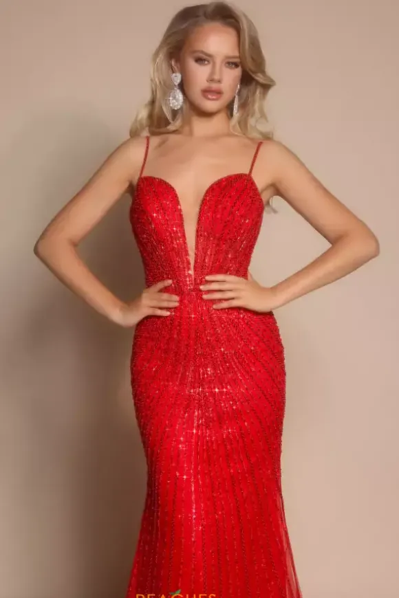 Look like you stepped off of the red carpet in this fierce Portia and Scarlett prom dress style XO019. Glistening stone beads garnish the plunged fitted bodice and cascade onto the no slit long skirt to exude radiance and glamor on top of the glitter tulle fabric. This figure enhancing dress has a zipper closure.