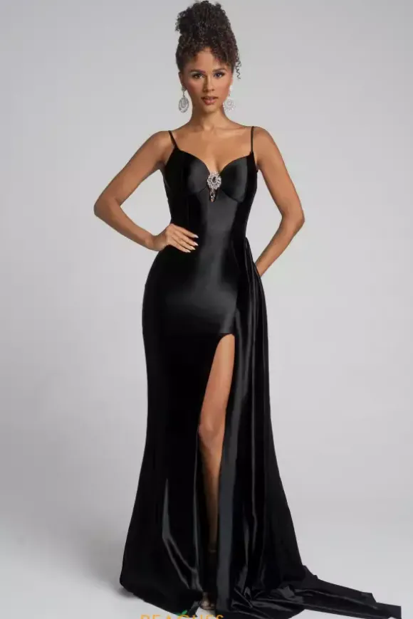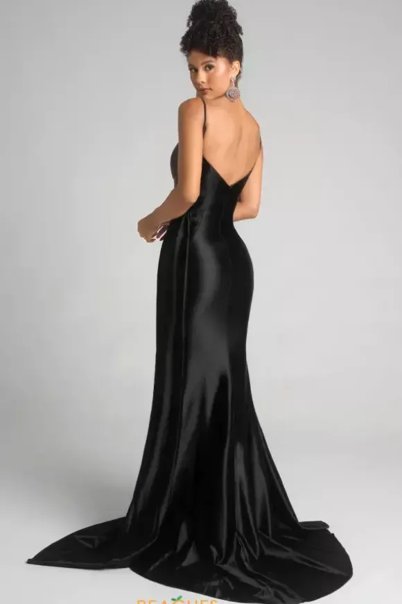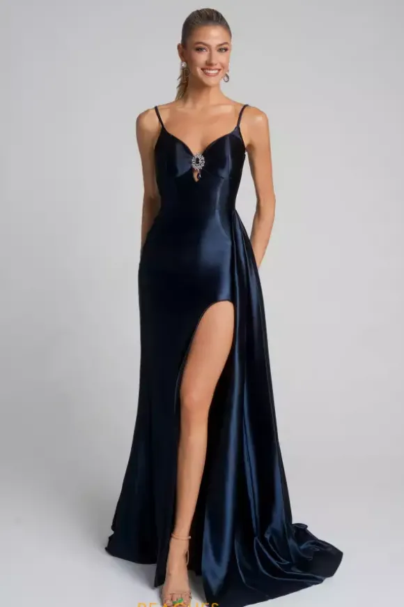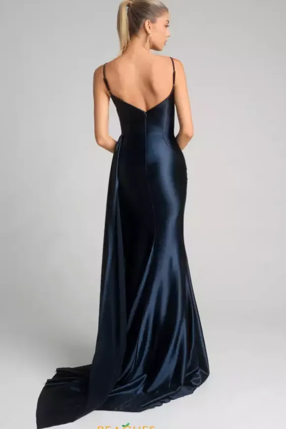 Love your curves in this lustrous satin Portia and Scarlett prom dress style XO037. This classic dress has an enlarged bead embellishment on the center of the v neckline to complement the dainty keyhole cutout. The shark bite slit and sweep train are highlighted by a satin drape overlay that cascades down a single side.