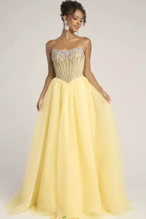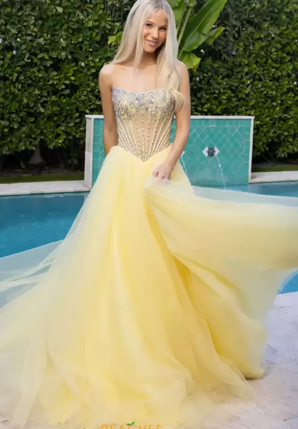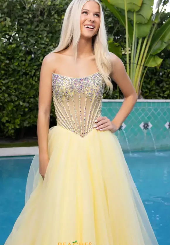 Twinkle beautifully at your event in this romantic styled Portia and Scarlett A line dress style XO047. The pointed scoop neckline is garnished in high quality stone beads that trace the boning of the mesh panel corset bodice. The voluminous glitter tulle skirt has no slit and is on trend with a sweep train.