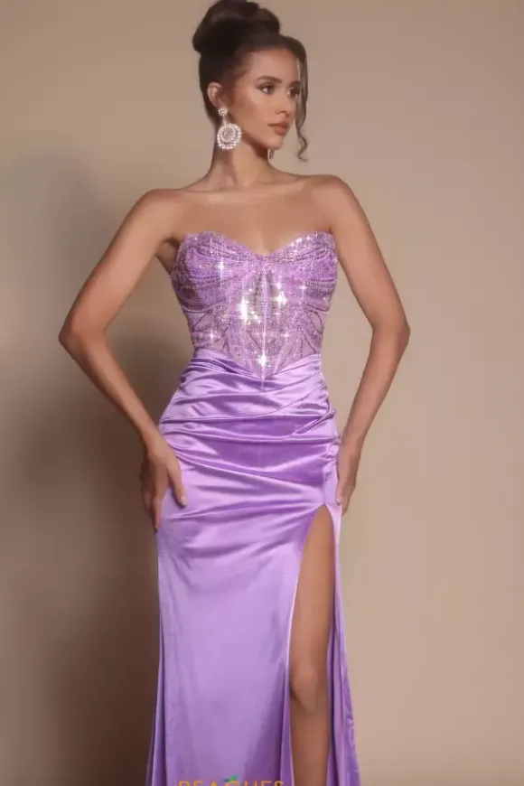 Symmetrically adhered beaded patterns dazzle amongst the adjustable bodice of this strapless Portia and Scarlett dress style XO065. Sleek lustrous satin effortlessly hugs your hips and curves while featuring flattering ruching to enhance your figure. This classic style has a popular thigh high slit and satin sweep train.