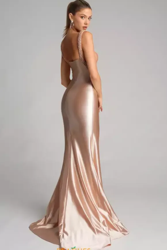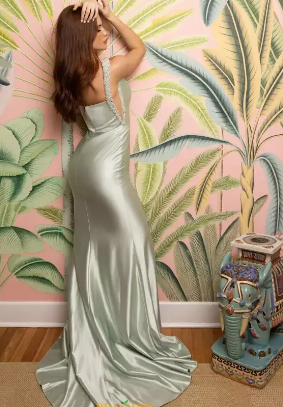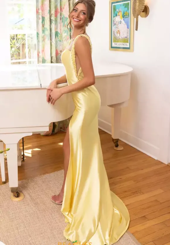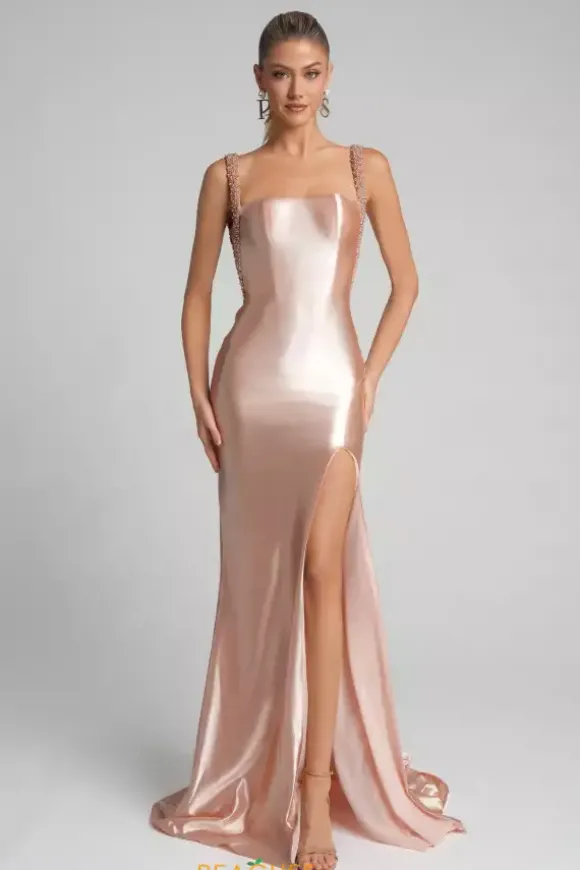 Elegance seeps from the extravagant fitted satin silhouette of this brand new Portia and Scarlett prom dress style XO074. The straight bodice is supported by thick beaded straps that reveal plunged mesh underarm cutouts for subtle sexiness. Strut confidently with a thigh high slit and light sweep train.