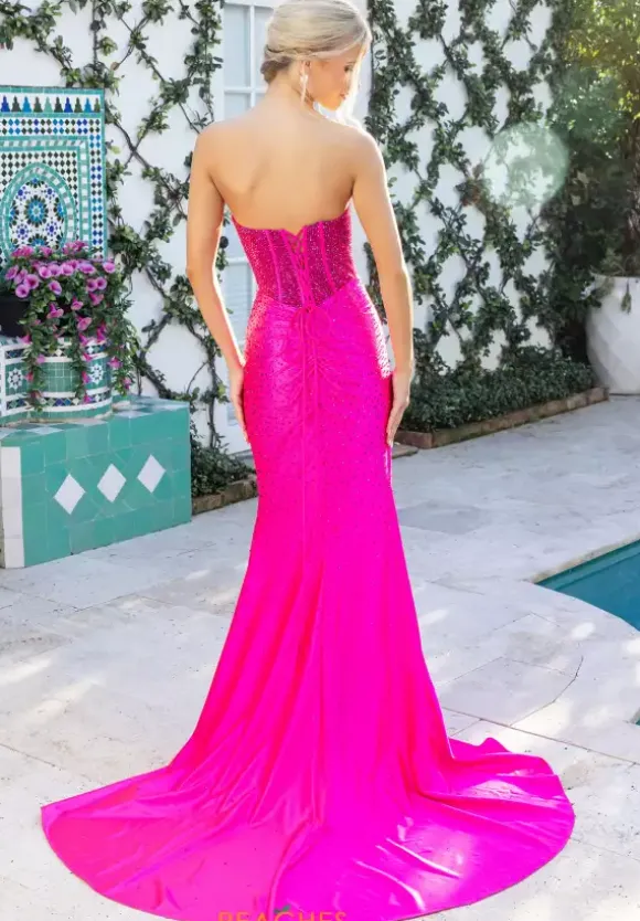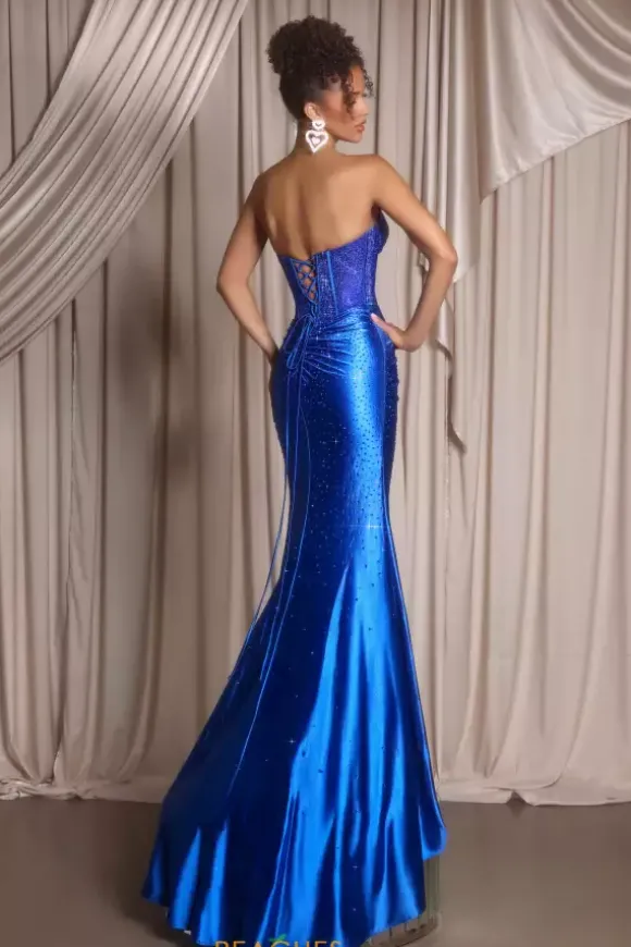 Gleam like no other with shocking long style XO098 by Portia and Scarlett. Eye catching strapless corset bodice is delicately embellished with hot pressed rhinestones all over the illusion bodice. Body hugging sating skirt displays beadwork which cascades down sparsely as it reaches the fly away train.