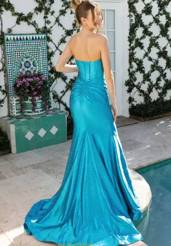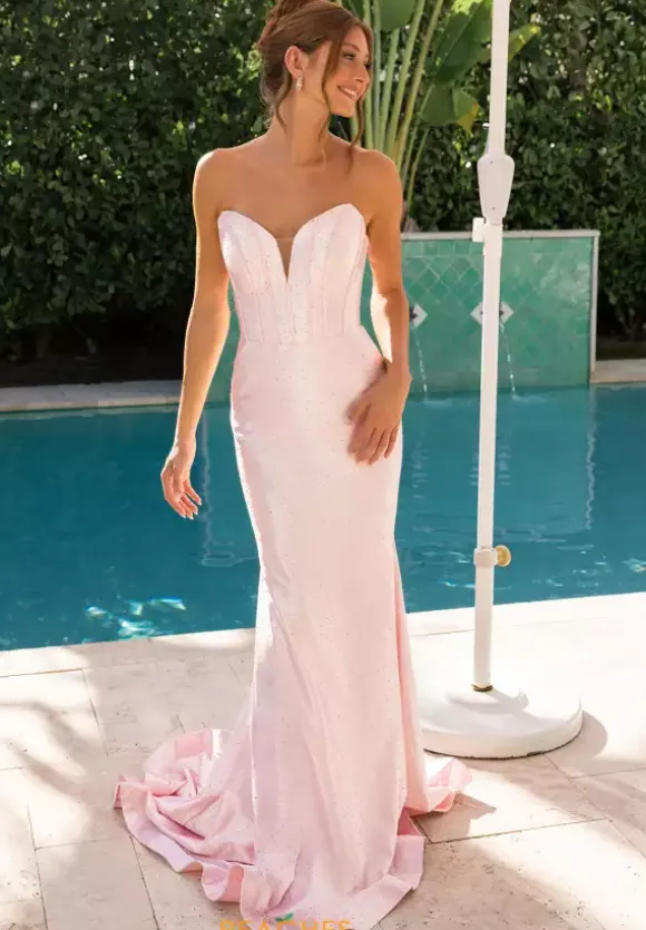 Look sleek and elegant in this gorgeous long fitted dress by Portia and Scarlett style number XO158. This lovely dress features a classic strapless V neckline with a structured corset bodice and exposed boning. The entire dress is made out of a silky stretch satin material and is completely embellished in stunning beadwork.