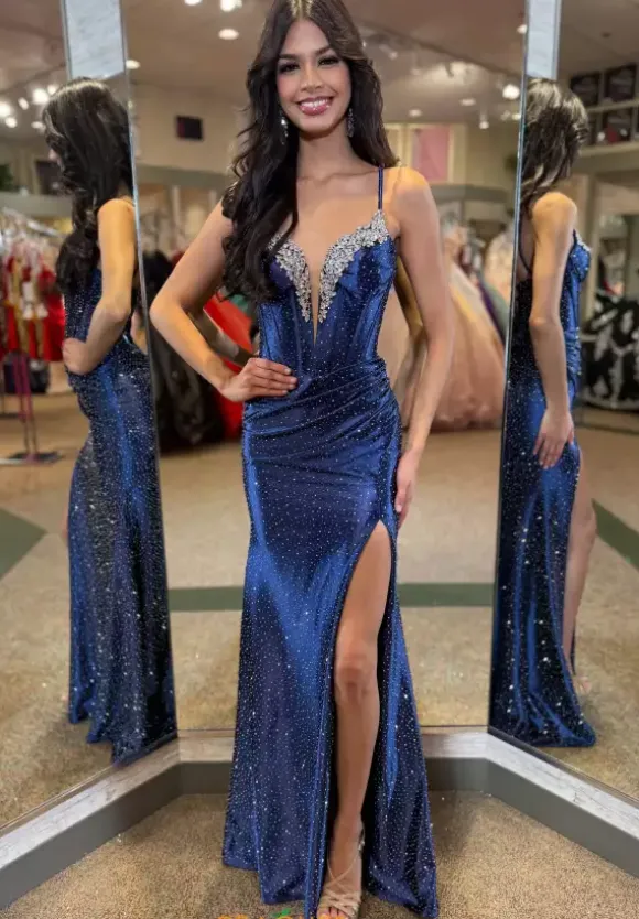 Glistening long style XO160 by Portia and Scarlett will have heads turning. Featuring the impressive corset lace tie bodice intricately embellished with trailing beadwork along the trim of the plunging neckline. Showcasing the impeccable sparsely places hot pressed rhinestones to have you gleaming perfectly in any spotlight.