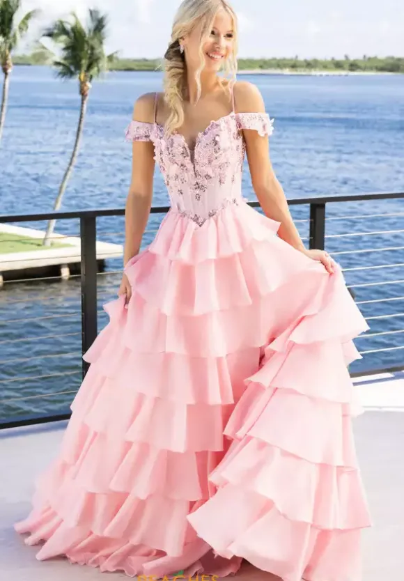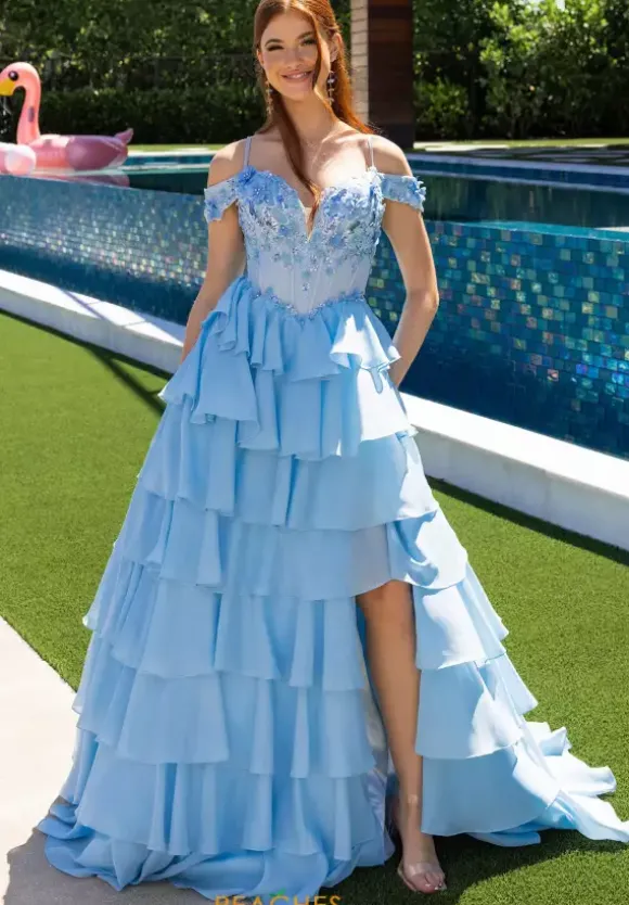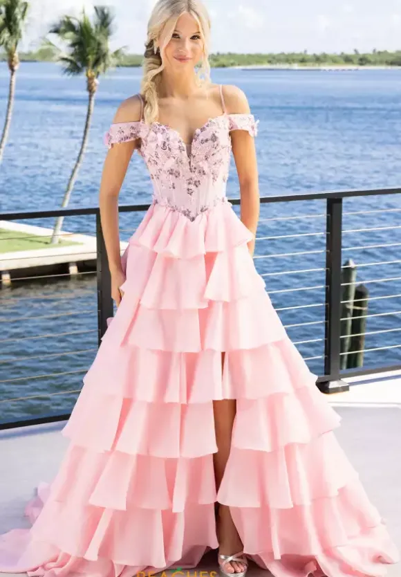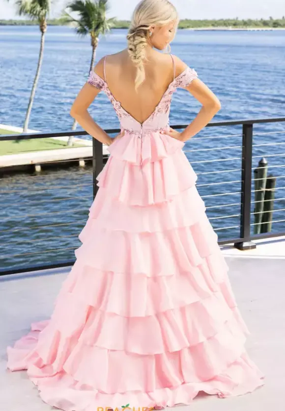 Go with a flow when you wear this extravagant Portia and Scarlett multi tiered prom dress style XO171. The silky layers of chiffon fabric add movement to the playful thigh high slit a line skirt while the glimmering beaded corset bodice cinches the small of your waist. The floral embellished off the shoulder neckline is complemented by a v cut low open back.