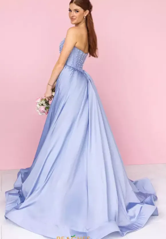 Dance the night away in this fabulous Portia and Scarlett a line dress style XO178. The beautifully hand beaded strapless sweetheart neckline corset bodice has pearl and beading details. The long taffeta skirt falls from your waist with a thigh high slit. The stunning train trails right behind you.
