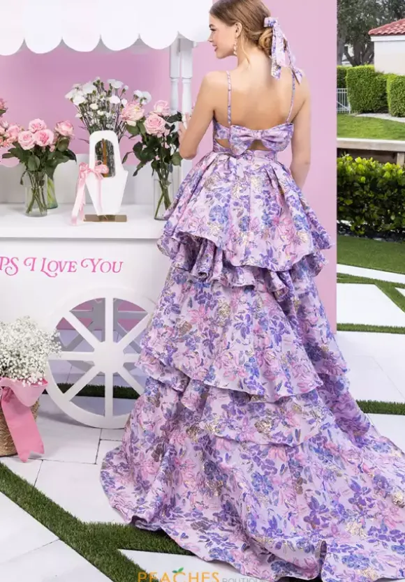 Be the envy of all when you wear this trendsetting Portia and Scarlett textured prom dress style XO181. Subtle beadwork traces the v neckline for radiance while the printed brocade fabric exudes a sleek shine all the way down to the extra long statement sweep train. The peek a boo thigh high slit completes this look.