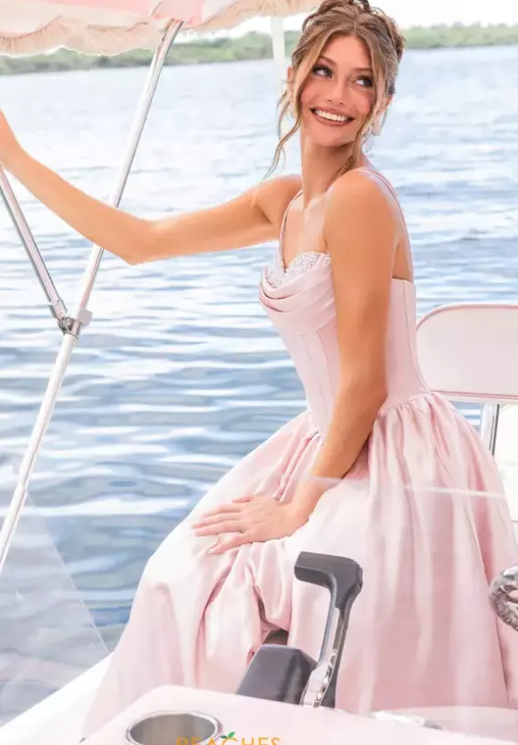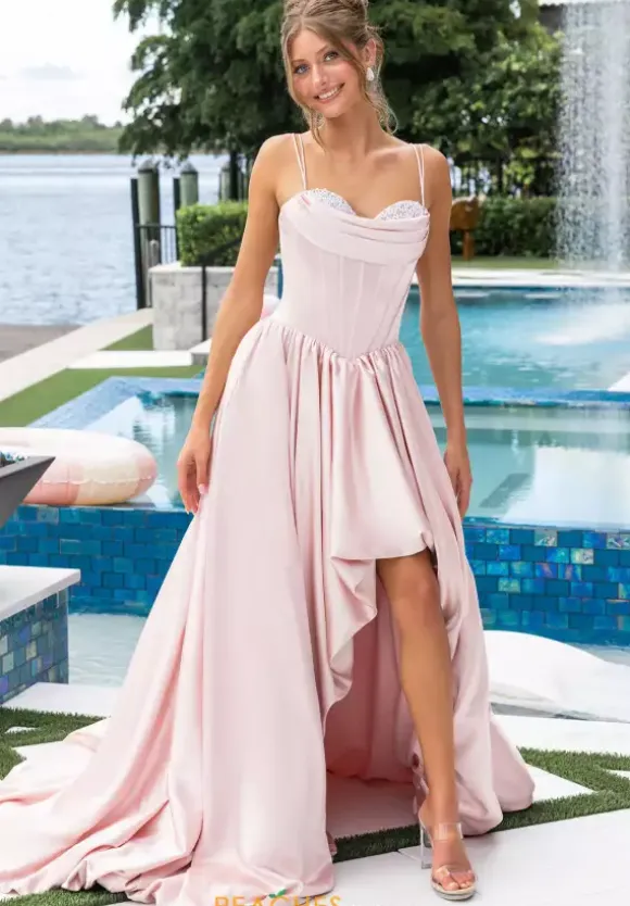 Come and go in fashion when you wear this unforgettable Portia and Scarlett high low prom dress style XO182. Color matching beads sleekly glimmer on the sweetheart neckline beneath the silky satin pleating under bust of the structured corset bodice. The voluminous satin skirt flaunts a strut worthy high low bubble hem and sweep train.