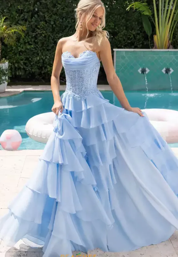 Dance the night away in this light and airy chiffon Portia and Scarlett a line prom dress style XO189. The strapless sweetheart neckline bodice showcases these gorgeous lace appliques over the boning. The tiered layered chiffon material skirt has the right amount of fullness with a front side slit.