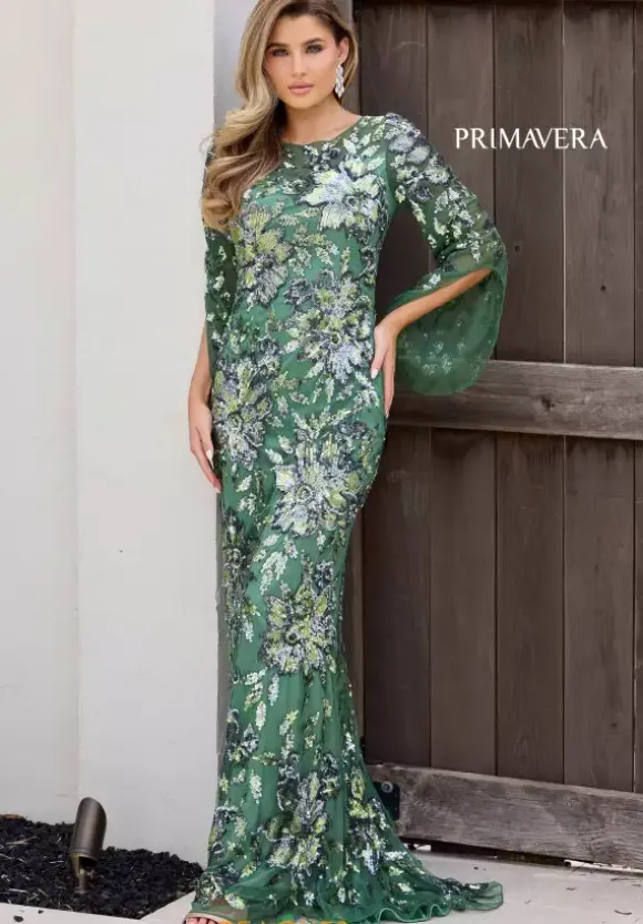 Grab the attention of all wearing the fascinating long style 12171 by Primavera. The high neckline is combined with delicately beaded long sleeves with a bell like ending. Showcasing the unique sequin displayed all over the entire fitted silhouette to have you glistening perfectly all night from every angle.