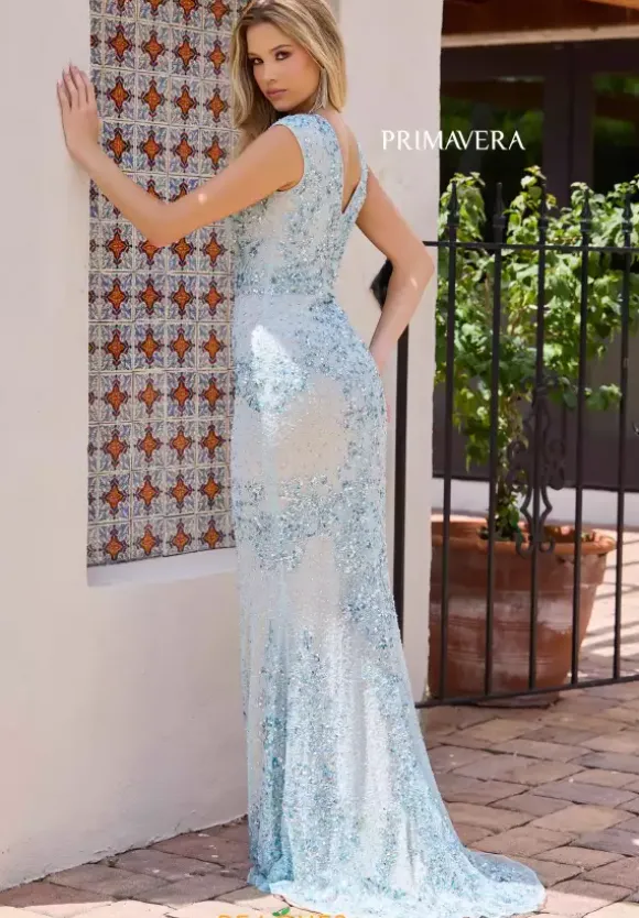 Glisten effortlessly with the long style 12175 by Primavera for your upcoming prom. Featuring the lovely thick straps complimented with a v neckline and matching low cut back. Showcasing the delicate sequin trailing beautifully down the fitted gown to have you illuminating effortlessly all night long.