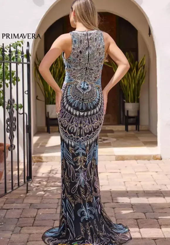 Draw attention immediately in this stunning long style 12176 by Primavera for your upcoming event. Featuring the combination full high neck along the back paired with a flattering v neckline. Adorned delicately all over the fitted silhouette and finishing with the draped overlay cape to hang just along the neck embellished with meticulous beadwork.