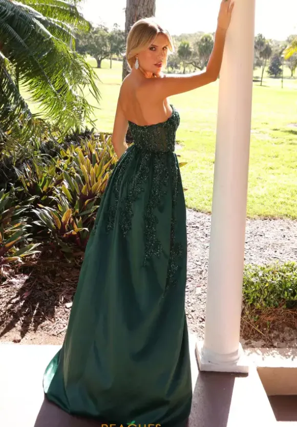 Be the embodiment of glitter in this ultra shiny Primavera bedazzled prom dress style 12213. From the strapless sweetheart neckline down to the straight sweep train, glimmering combinations of beads and sequins encrust the body con silhouette in a stunning pattern that matches tot top of the extra long satin overskirt.