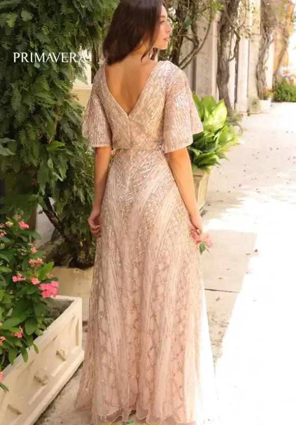 Feel like a modern day princess in this enchanting long a- line dress by Primavera, style 13119. Featuring an a-line silhouette with a modest v neckline that has gorgeous flowy cap sleeves. This ensemble is fully adorned with glistening sequins and beautiful intricate beadwork that sure to have you sparkling all night long.