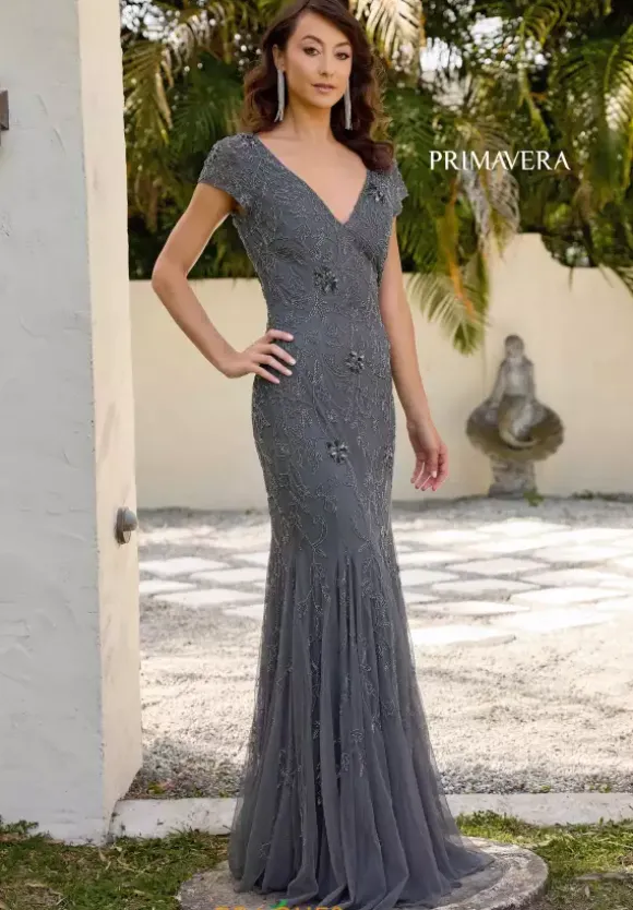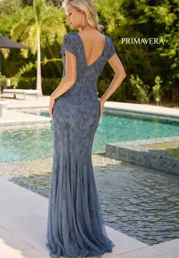 Strike a pose in this chic memorizing long fitted dress by Primavera style 13133. The bodice has a alluring v neckline that cascades to lovely cap sleeves like no other giving you that classy look. The beadwork on this dress is perfect for extravagant long lasting impressions. The train on the dress is excellent for dancing the night away.