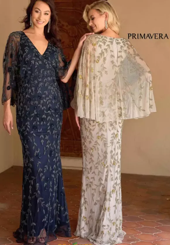 Make a grand entrance in this glamorous gown by Primavera style 13149. Featuring a subtle v cut neckline paired with a stunning cape attached to the straps. Adorned entirely in a stunning beading and sequins made into a chic floral pattern. The fitted silhouette will hug your curves beautifully. A subtle sweep train is added to complete the look.