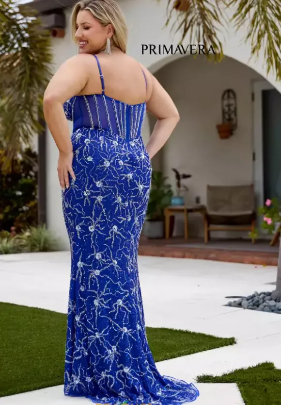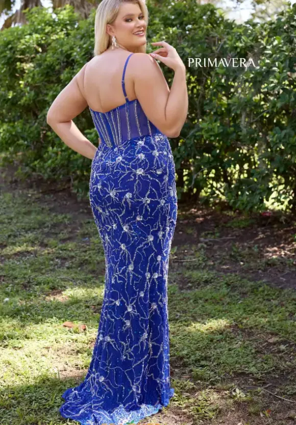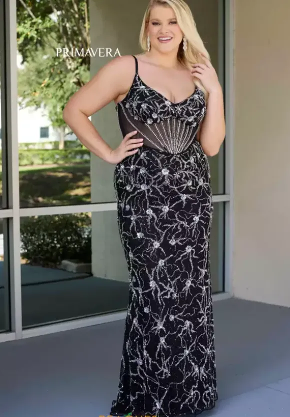 Have all eyes on you in this stunning gown by Primavera style 14079. Showcasing a modest v cut neckline paired with dainty straps and a full zipper back. The fitted corset will flatter your figure giving you a beautiful hourglass shape. Adorned in a gorgeous beadwork made in an intricate pattern that will leave an unforgettable impression.