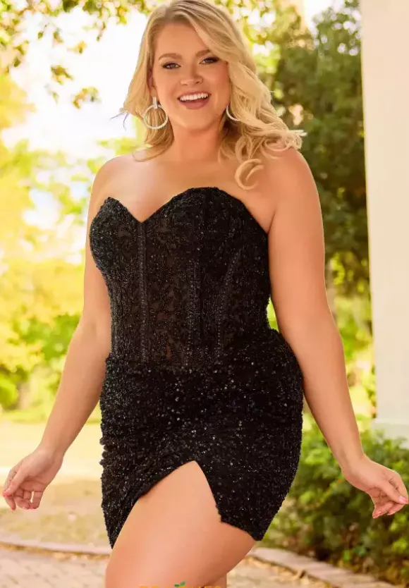Leave everyone speechless wearing this incredible Primavera dress, style 14098. This short fitted dress showcases a stunning strapless sweetheart neckline paired with a gorgeous beaded corset that will cinch your waist, giving you a snatched look. The skirt is completely adorned with sparkling sequins that will make you shine from any angle and also features a fabulous slit that adds a wow factor.