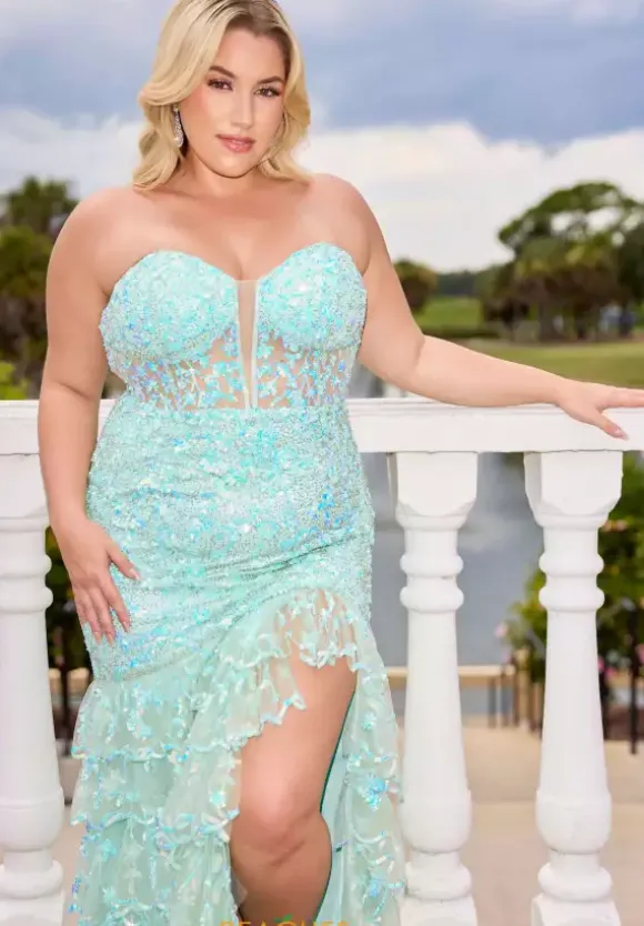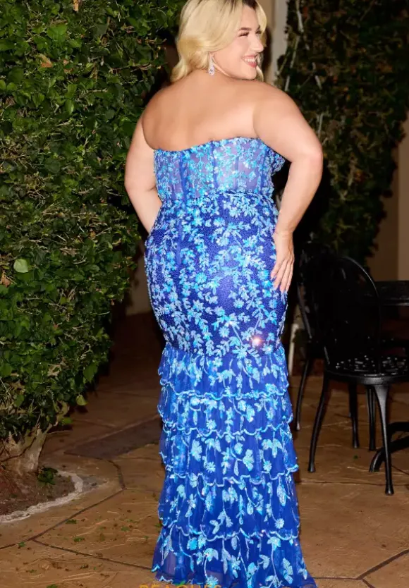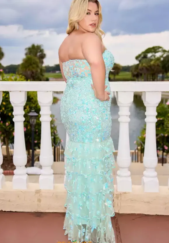 Look ethereal in this magnificent Primavera sequin encrusted prom dress style 14105. The strapless curve enhancing body con silhouette glimmers endlessly with a base adorned in dainty heat set stones that shimmer between the detailing of the sequin vines and leaves that surround the entire multi tiered sweep length dress.