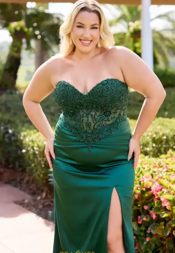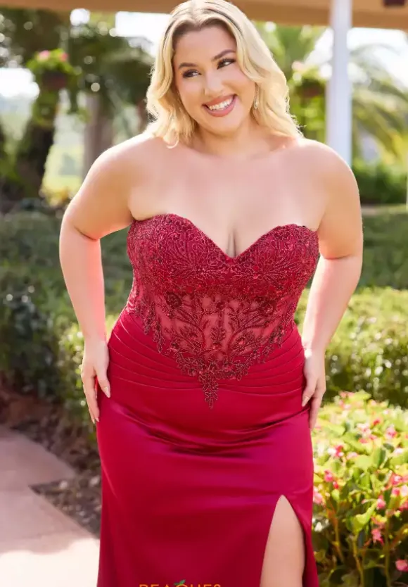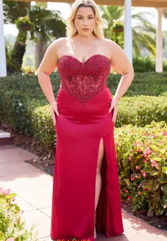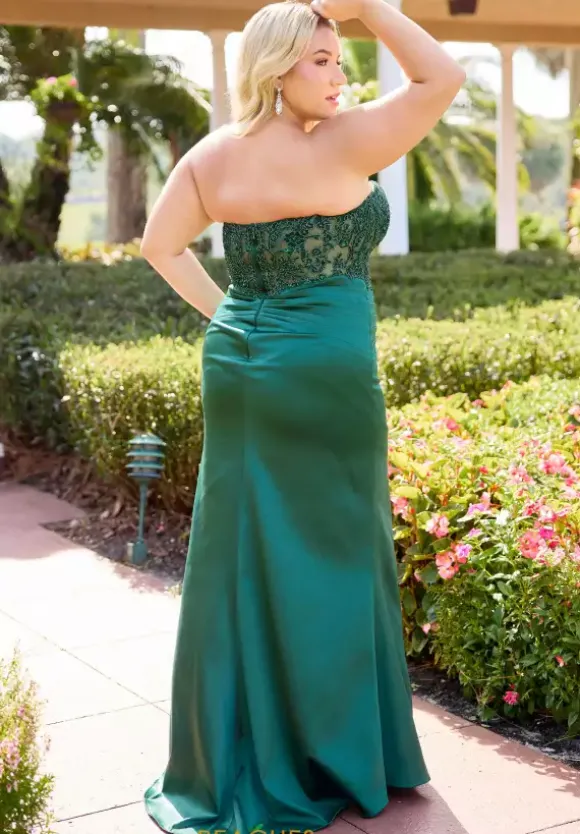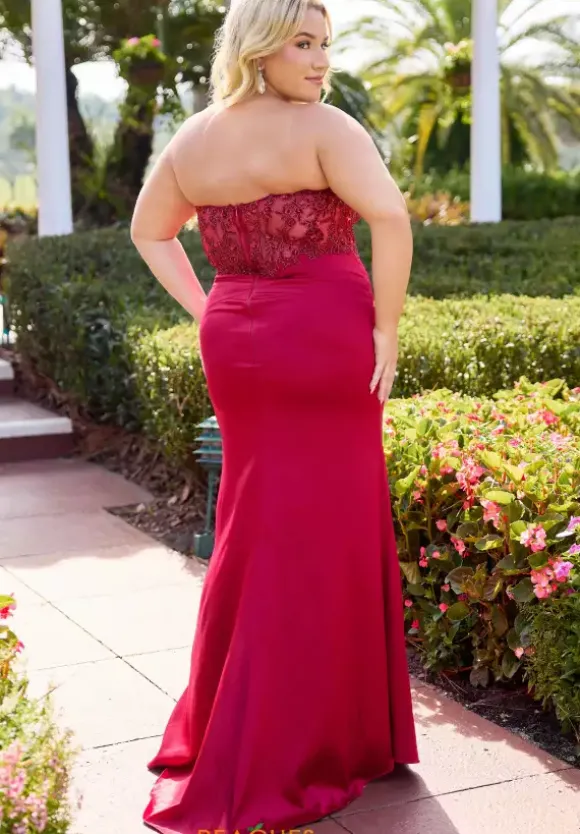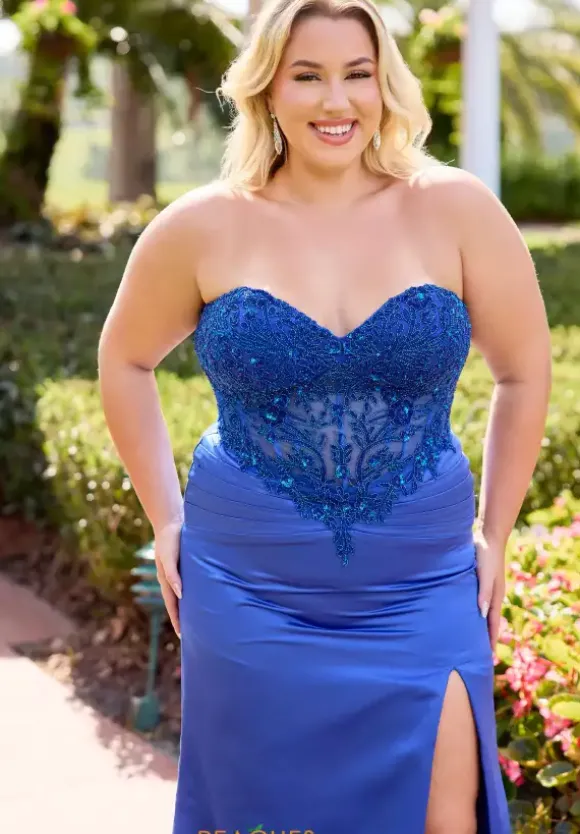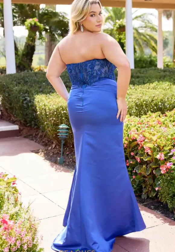 You can never go wrong with a sleek Primavera dress like style 14109. This strapless sweetheart neckline bodice is embellished with tone on tone hand sewn beading over a sheer illusion waist line. The fitted satin long skirt hugs your curves with a thigh high front side slit with a gorgeous sweeping train.