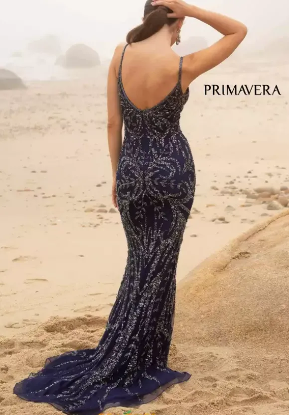 Set the trend in classy style 3793 by Primavera. This fitted silhouette is fully adorned in ornate beaded patterns that have been sewn to perfection to give you fascinating detail with radiant shine. The V neckline is supported by dainty straps that merge int a scoop open back. This dress is completed with a classic sweep train.