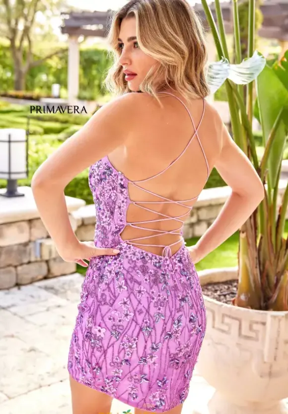Strut into your next special event wearing this one of a kind fitted short dress by Primavera, style 4033. Featuring a modest scoop neckline with spaghetti straps, leading to a gorgeous open lace up back that will hug your body gorgeously. Showcasing beautiful floral applique and designs with stunning beads and sequins throughout the dress.