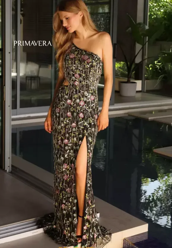 Be unique and stand out from the rest of the crowd when wearing this long fitted dress by Primavera, style 4131. Featuring a single shoulder asymmetrical strap leading to a back zipper closure with a cut out on the side. Showcasing unique floral designs and dazzling beadwork and sequins throughout the dress. To make a statement it has stunning fringe and a sexy thigh high slit. This number has a small beautiful train, you will for sure look gorgeous at your next special event.