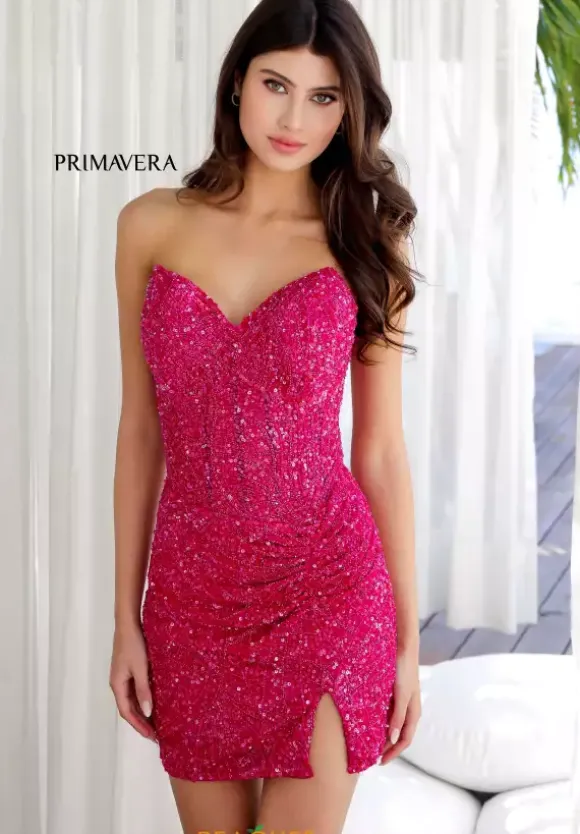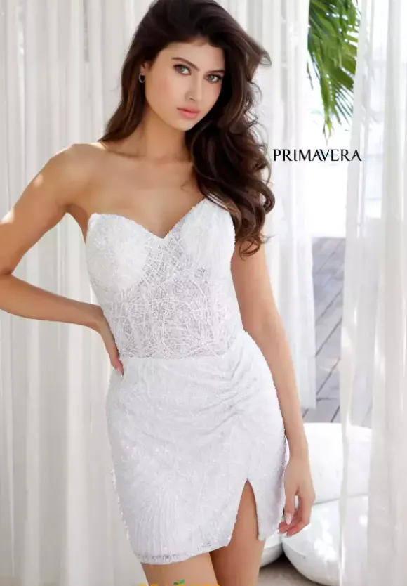 Be glamorous and wear the look of the season in this scintillating fitted short dress style 4201 by Primavera. This shimmering silhouette is encrusted with gleaming beads and glistening sequins that showcases a strapless v neckline with a low zipper back. The short slim fitting skirt has ruching and a front side slit that will show off your legs beautifully.