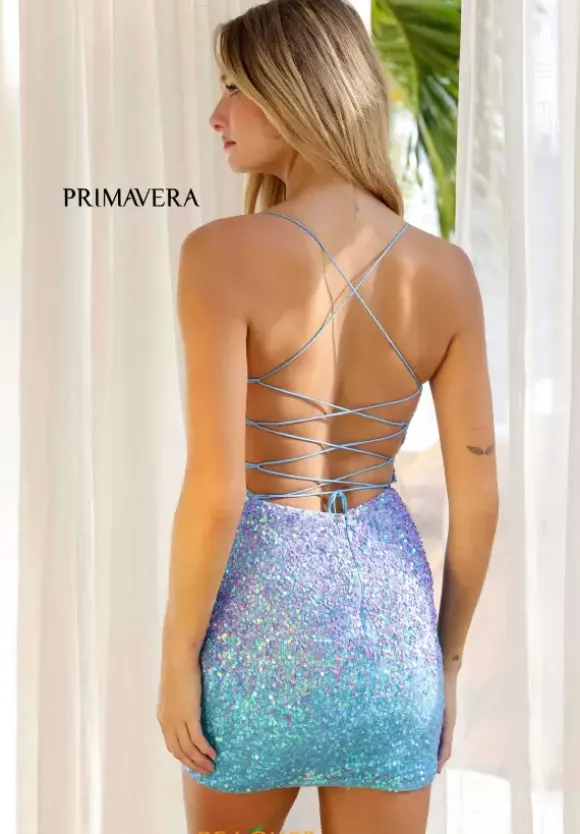 Find your fairy tale in this exquisite short fitted dress by Primavera, 4270. This fabulous dress features a scoop neckline with delicate thin straps that lead to a corset lace up back that will enhance your figure to perfection and give you a sexy open back. This glamorous dress is adorned from head to toe in glistening sequins and dazzling beadwork that give an entrancing ombre look to this ensemble.