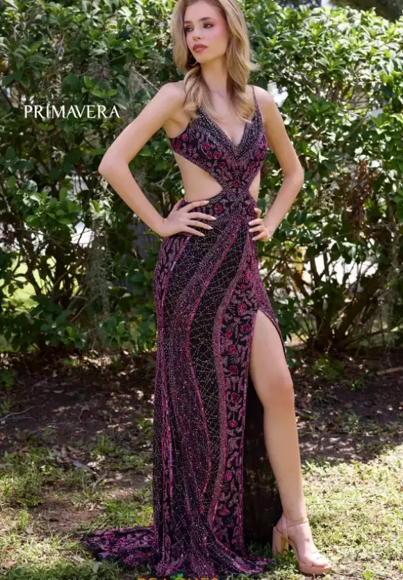 Have a dramatic entrance wearing this long fitted dress by Primavera, style 4308. Showcasing a plunging V neckline that follows into a corset lace up and flattering open back. Striking side cut outs on the bodice adds the perfect amount of fun and sexy to the dress. The slit and long train finish off this lovely look. This dress is adorned in glistening beadwork in lovely designs that’ll for sure have all eyes fall for you.