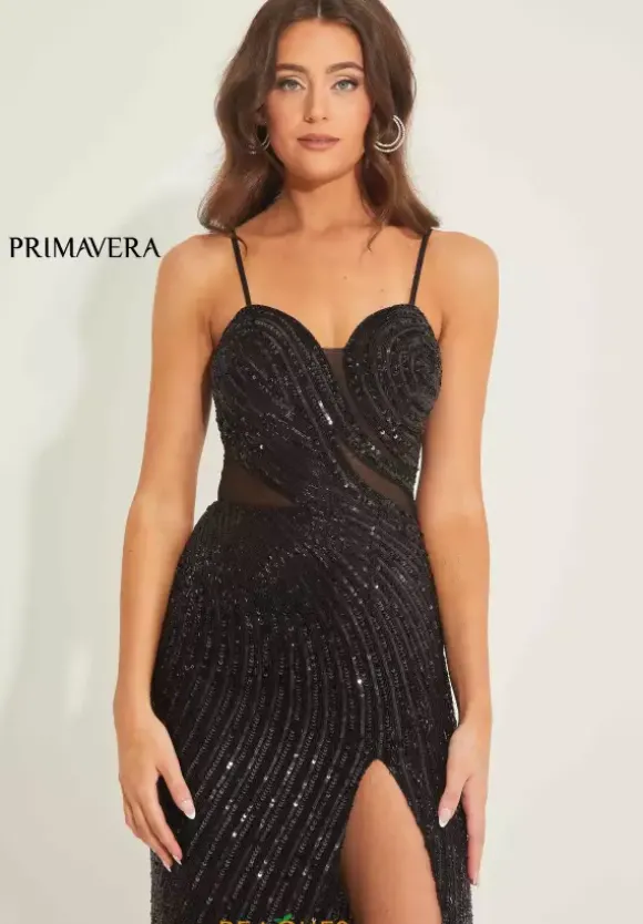 Make a statement in this all over sparkling beaded dress from Primavera style 4327. This sweetheart neckline dress showcases thin adjustable shoulder straps. The dress then has a side illusion cut out that matches the key hole slot openings in the front. The swirl pattern of beadwork travels all the way down to the hem.