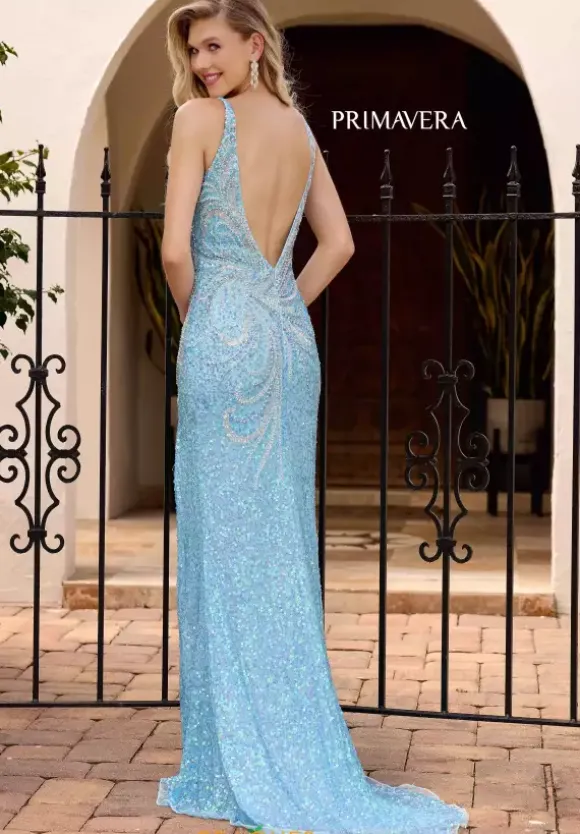 Look flawless when you wear this dress by Primavera style 4333. This fitted dress features a v neckline supported with thick straps which displays an open back. The bodice is decorated in beading and the train is covered in sequins. The final touch is the thigh high slit.