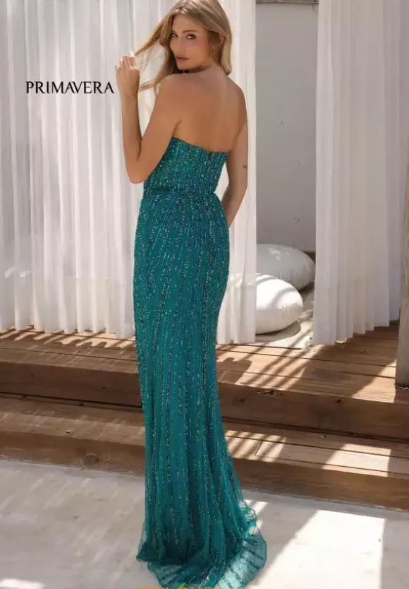 Enter with class and grace when you are wearing this dress by Primavera style 4358. This fitted dress features a strapless straight across neckline supported with a back zipper. This dress is decorated with beading and sequins which looks as its a star bursting starting from the waist. The finishing touches are the thigh high slit and a luxurious train.
