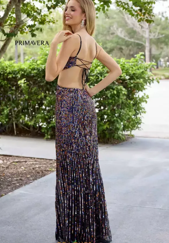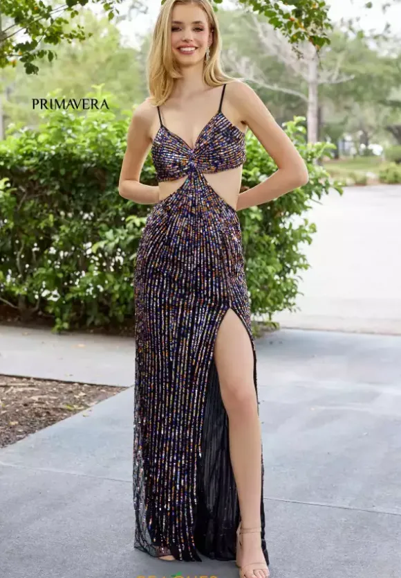 Have eyes on you all night when you wear this jaw dropping long fitted dress by Primavera, style 4370. Glistening and shimmering, this dress is adorned in stunning beadwork that will have you shine all night long. Featuring a striking V neckline and side cut outs that leads into a sexy open back. The slit allows you to strike a pose while the dramatic train cascades behind you.