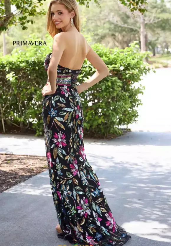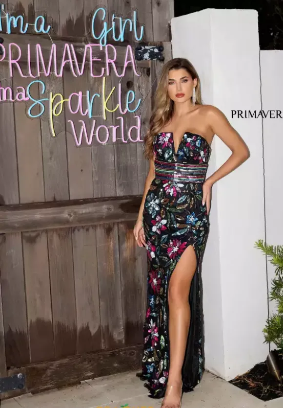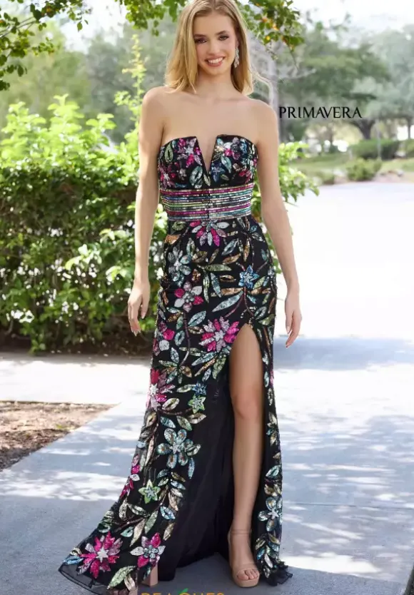 Look snatched and flawless when you wear this stunning dress by Primavera style 4372. The fitted dress features a strapless v neckline supported with a back zipper. This dress is decorated with horizontal beading placed around the waist and flowers placed all around the dress with beading and sequins. The finishing touches are the slit and the sweep train.