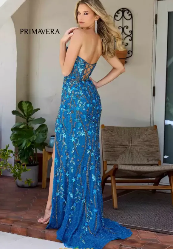 Unveil your charm when you choose to purchase this dress by Primavera style 4380. This fitted dress features a strapless scoop neckline with a mesh panel down the middle. The back displays a corset lace up to support and accentuate your figure. The thigh high slit is paired with the sweep train. The beading and sequins is formed in floral patterns, decorating the entire dress.
