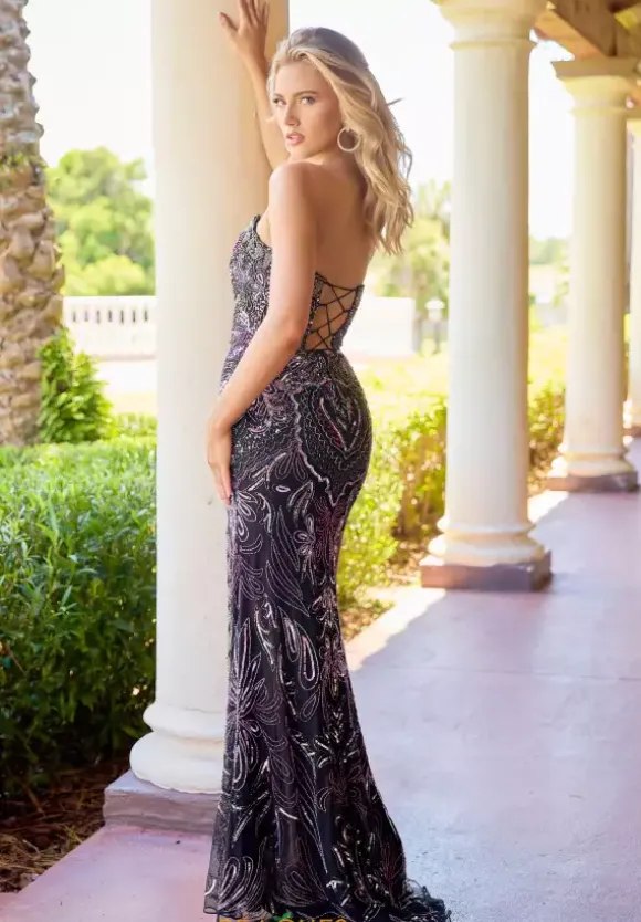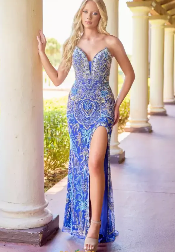 This glamorous strapless Primavera dress 4382 is the perfect choice for your next event. This dress is adorned with a unique beadwork that shimmers at every angle and a bold leg slit. A sweep train flows beautifully from the back, completing the look and giving just the right amount of elegance and glam.