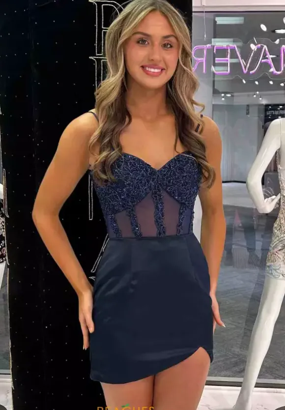 Exclude confidence in this sleek Primavera short dress for homecoming style 4437. The sheer illusion bodice has beaded appliques that adorn the sweetheart bust line. The also continue down the sheer illusion in a vertical pattern. The dress has adjustable thin shoulder straps. The fitted sleek skirt has an asymmetrical hem.