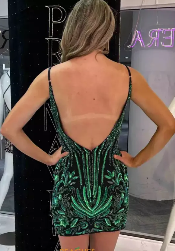 Unique short fitted dress style 4449 by Primavera will leave everyone speechless. Showcasing the flattering v neckline accompanied with an alluring low cut open back. Elaborate beadwork starts along the top and trickles down the bodice and becomes intricate along the bottom of the fitted skirt to have you setting the trend this season.