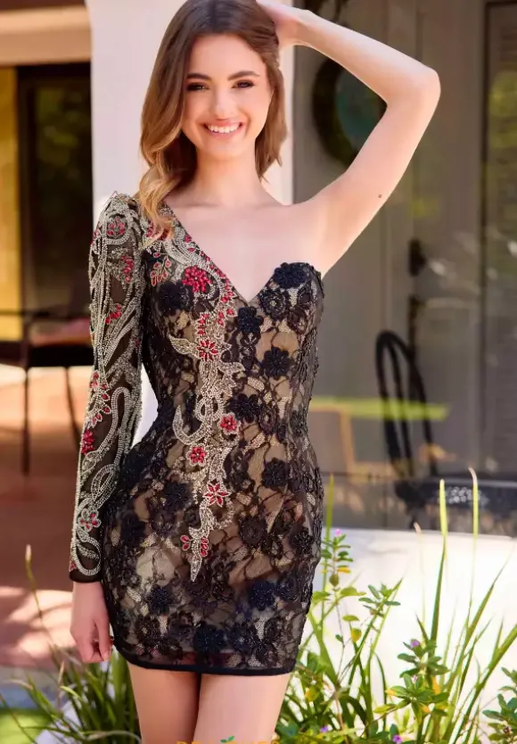 Interesting short style 4451 by Primavera will leave the perfect everlasting impression. The asymmetrical single long sleeve is fully decked out in meticulous beadwork and is complimented with a half sweetheart neckline. Showcasing the fitted silhouette fully made from a lace material and adorned with delicate and intricate beading.
