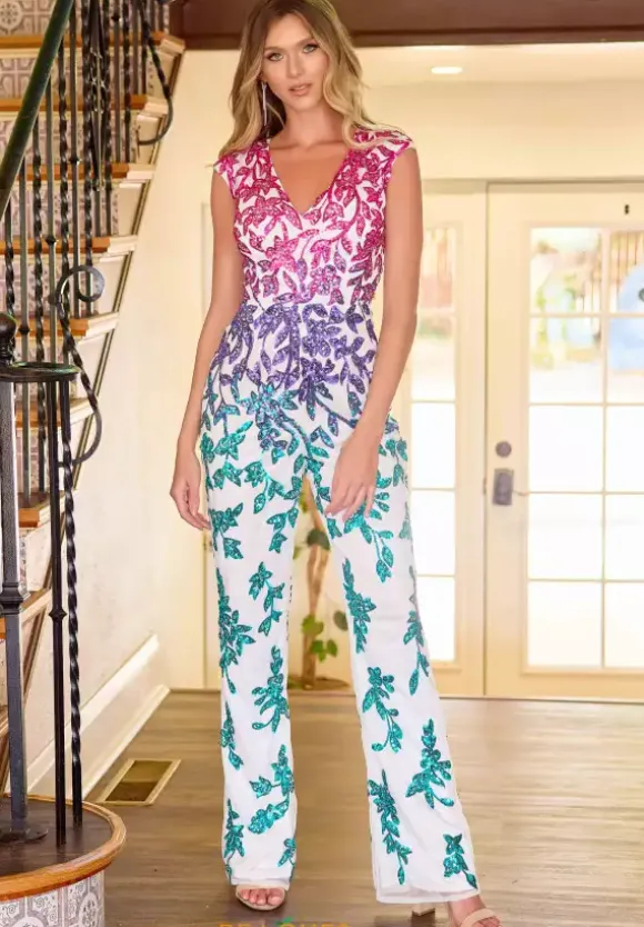 Leave eyes twinkling in show stopping jumpsuit style 4467 by Primavera. Featuring the thick cap sleeves and plunging v neck combination to flatter the neckline beautifully. Unique leafy sequin start along the top of the sleeves and cascades and interchange on the color scheme meticulously and sparsely down the legs of the pants to give you that over all runway ready look.