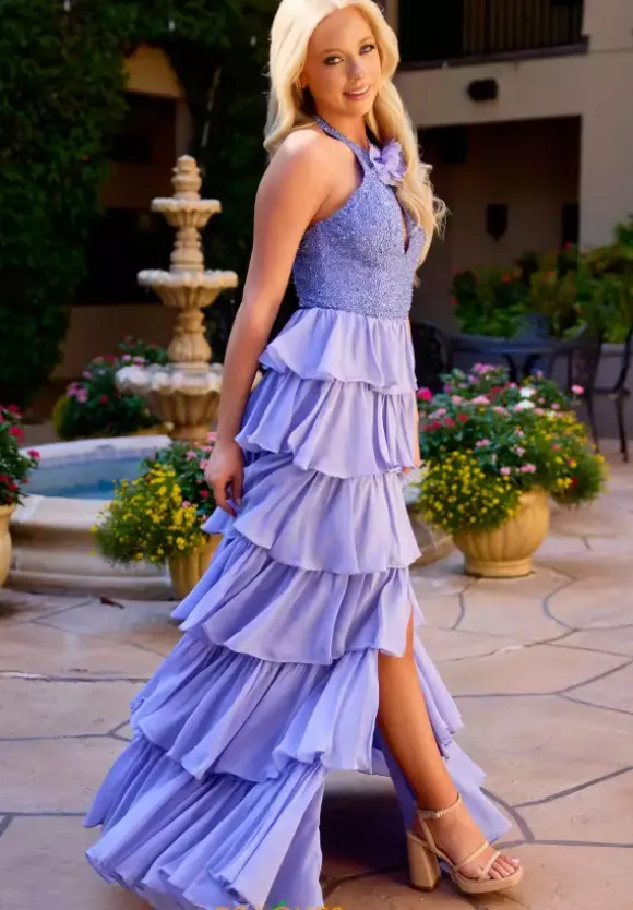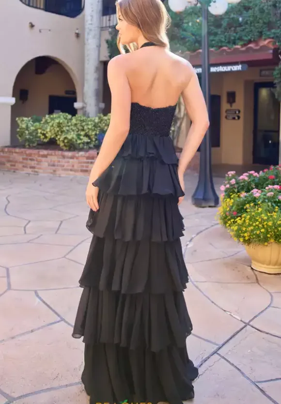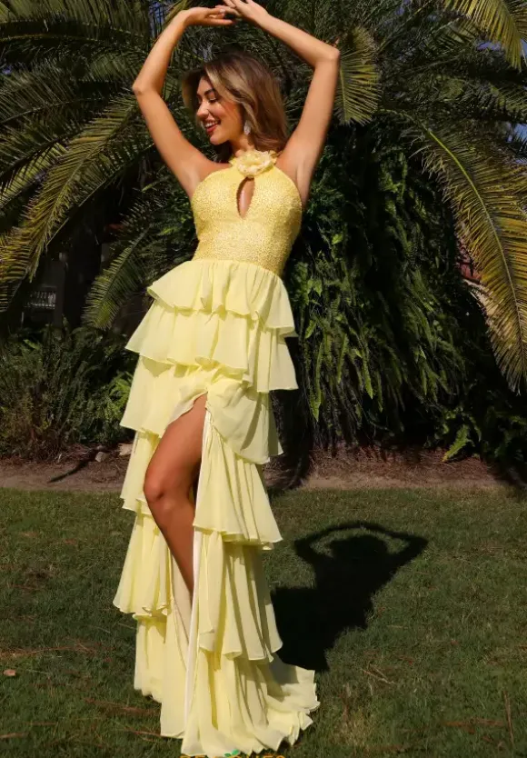 Leave everyone jaw dropped when you wear this one of a kind long A line dress by Primavera style 4530. This unique dress features a high halter neckline that cascades into a back zipper. This dress is made with chiffon material and decorated with beadwork and sequins as well as a ruffle skirt with a slit that will complete the look.