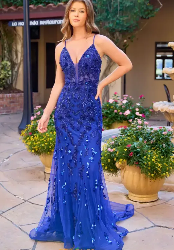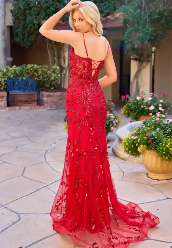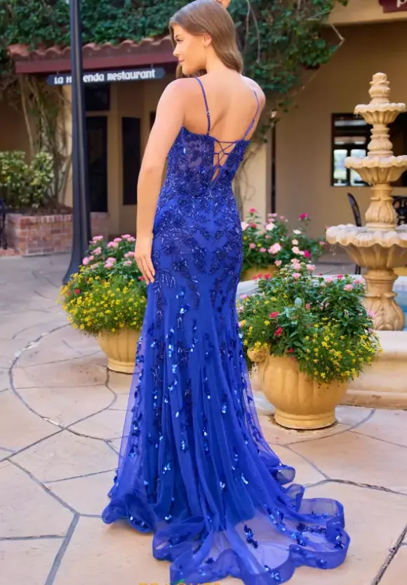 Make a dramatic entrench when you wear this charming long fitted dress by Primavera style 4532. This dress features a V neckline that cascades into a stunning open back with a corset lace up that will hug your curves beautifully. The entire dress is adorned with beadwork and sequins as well as a train that gives the dress a more dramatic look.